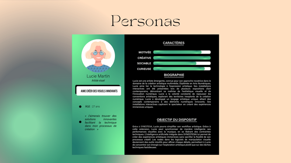 Extension des logiciels de VJing (animation visuelle projetée en temps réel) permettant la génération de visuels synchronisés avec la musique basé sur une analyse de cette dernière. Tout cela réalisé via à l’utilisation de l’intelligence artificielle générative.
